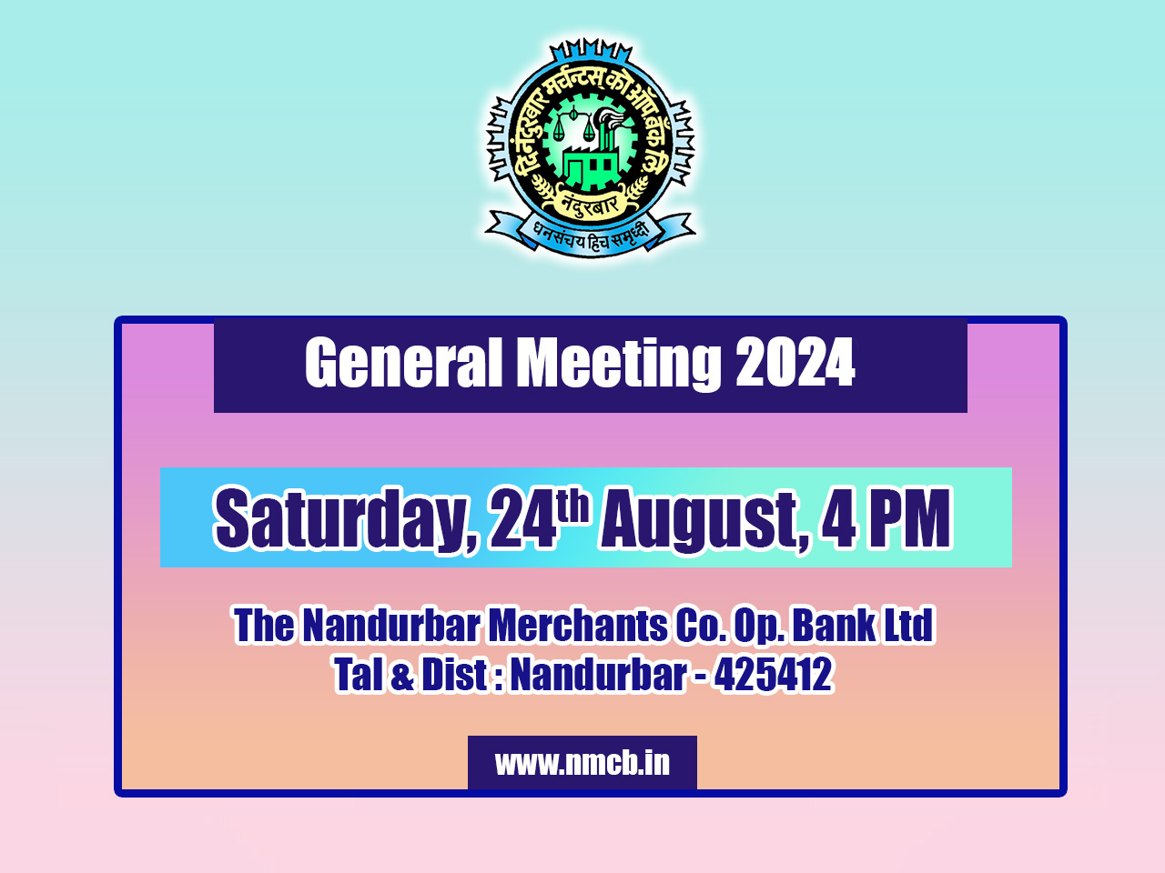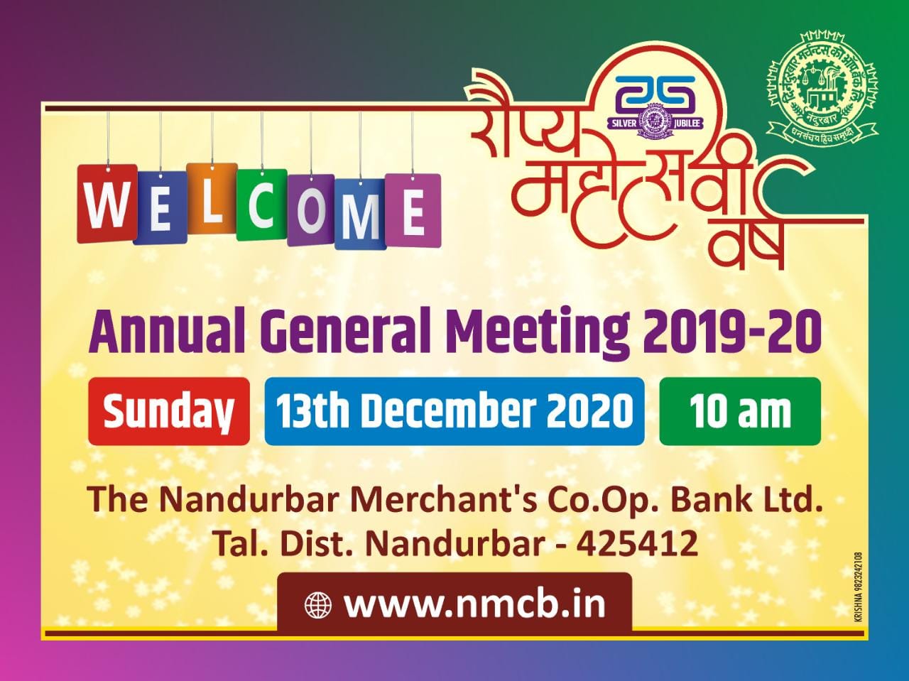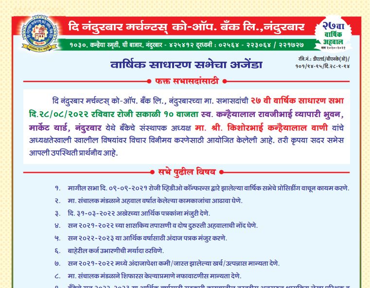 Hence ,The Nandurbar Merchants Co-operative Bank Ltd. came into existence on 01 April 1995 with the vigorous efforts taken by Shri. KISHORBHAI KANHAIYALAL WANI. Now the bank is having its registered office at 1030, KANAIYA SMRUTI GHEE BAZAR, NANDURBAR-425412 . The Bank is also having Banking License No. UBD/MH/1108 P date-07/01/1995 from Reserve Bank of India to transact Banking business.